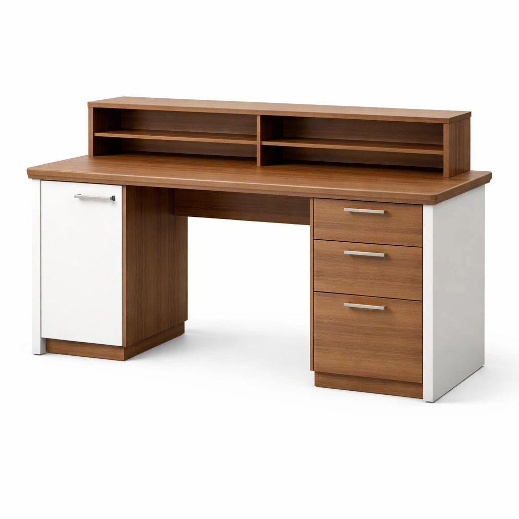 La scrivania dispone di una superficie di lavoro in legno laminato e metallo. Include tre cassetti e un'anta con maniglie in acciaio per l'apertura. Il design è completato da una scaffalatura superiore incorporata per l'organizzazione.