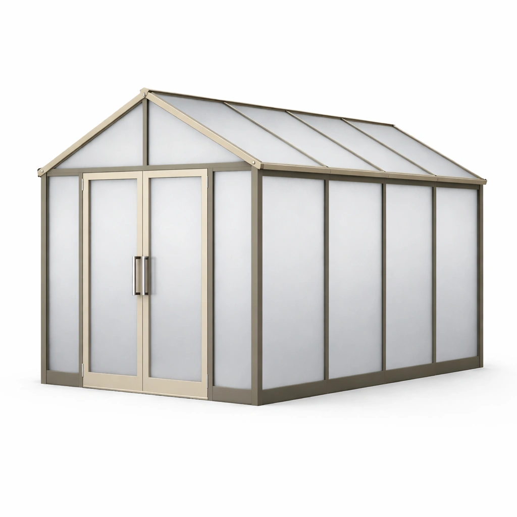 Struttura in alluminio con pannelli di policarbonato trasparente da 5 mm, resistente agli agenti atmosferici. Dimensioni: 300 cm lunghezza, 200 cm larghezza, 250 cm altezza. Peso netto: 80 kg. Colore principale: Trasparente/Grigio. Dotata di isolamento termico e resistenza ai raggi UV. Include porta a doppia anta con componenti di fissaggio.