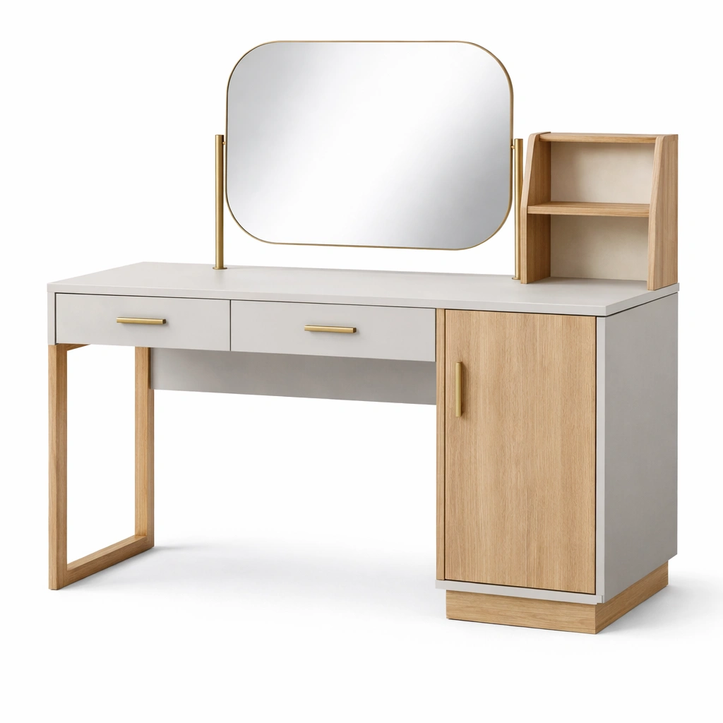 Questo tavolo da toeletta è dotato di una struttura in legno MDF e dettagli in legno di rovere. Include uno specchio rettangolare in vetro temperato da 5 mm e due cassetti per lo spazio di archiviazione.
